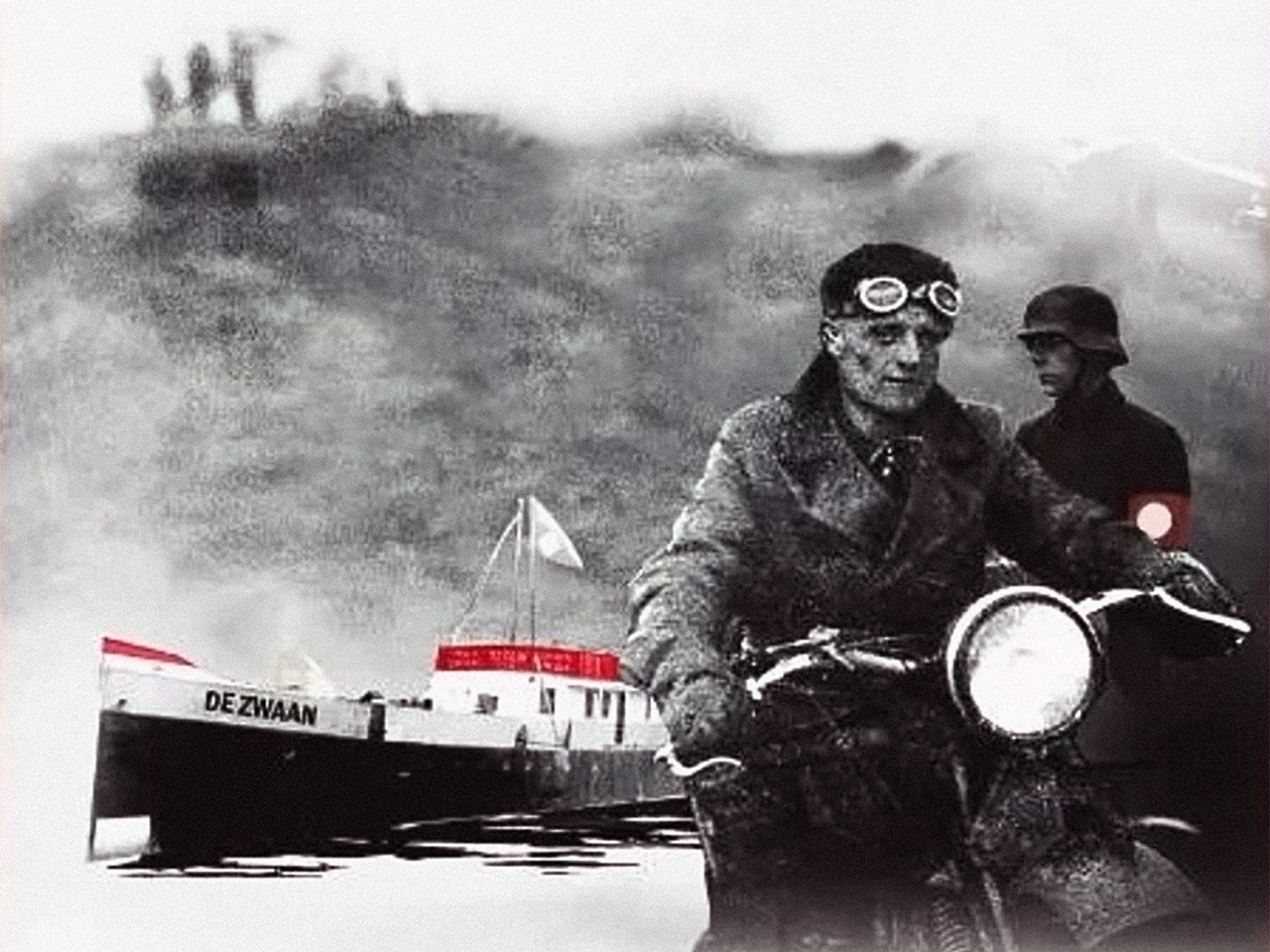 Boekcover van Geheimen boven water – Het drijvende Achterhuis van Jeanne Zwaags, met een oude motor, schip ‘De Zwaan’ en figuren in oorlogstijd.