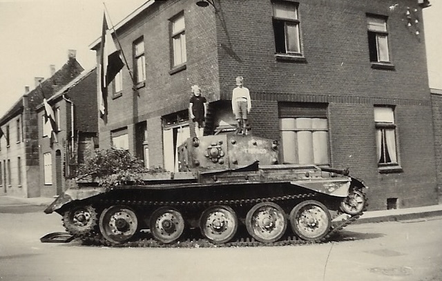 Zwart-witfoto van een beschadigde tank op een straathoek in een Nederlands dorp, vermoedelijk uit de Tweede Wereldoorlog. Twee kinderen staan bovenop de tank. Aan de omliggende huizen hangen vlaggen, wat wijst op een bevrijdingsmoment.