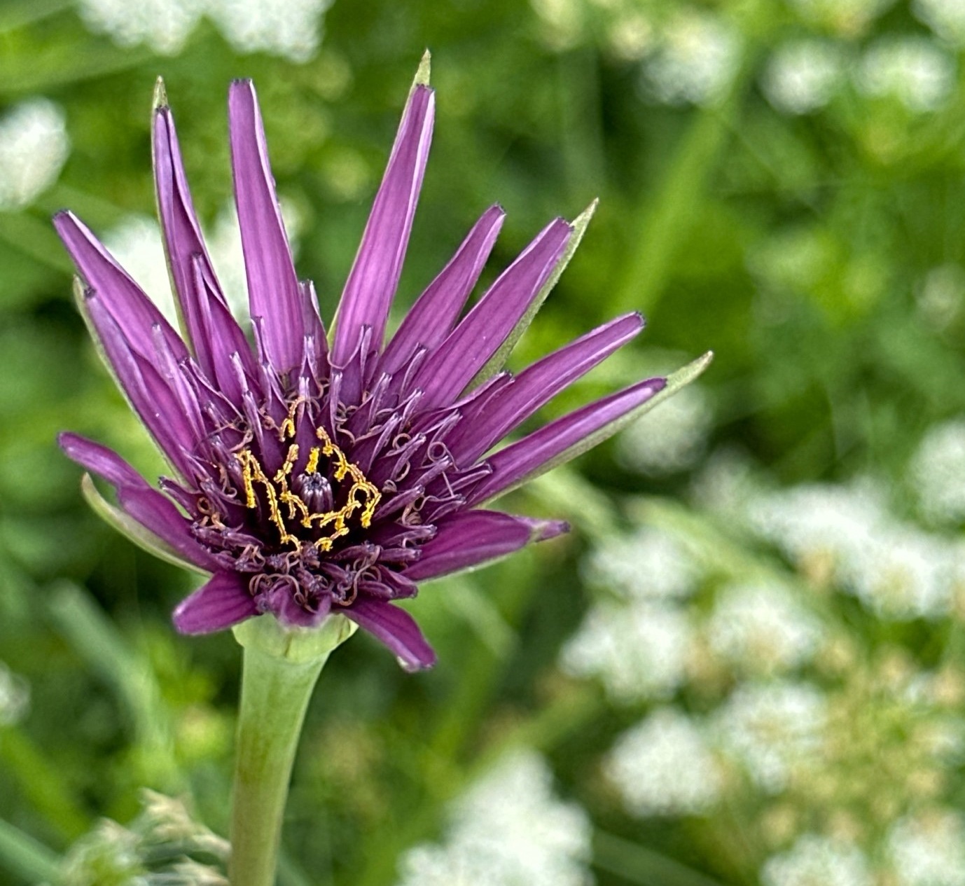 Paarse bloem in close-up, met scherpe details en groene achtergrond op de achtergrond vaag zichtbaar